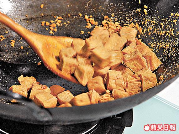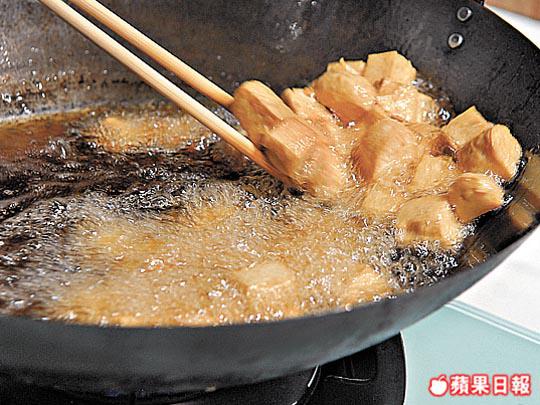 3.用回剛才的熱油開大火加熱至120℃,放入豆腐粒炸成金黃色,盛起隔油。