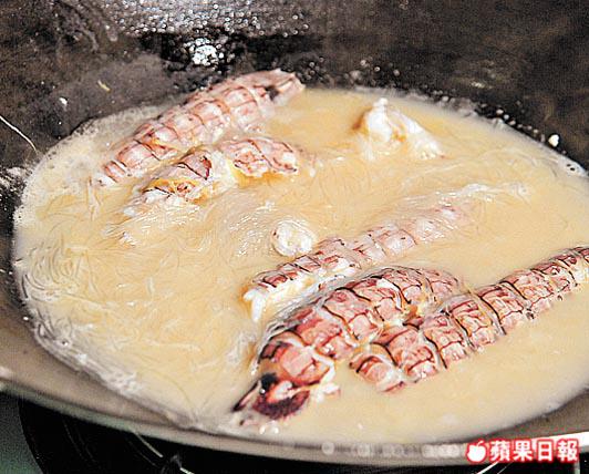 避風塘菜式多以炸蒜香葱大爆炒,莫說用來煮鮮甜海鮮,就算做豆腐,都誘惑非常。林師傅做的風沙豆腐,不但香口惹味,還真能如正宗蜂巢豆腐般鬆化脆口,不過他不會將豆腐急凍一天做蜂巢,只要蒸20分鐘,亦可做到同樣效果!