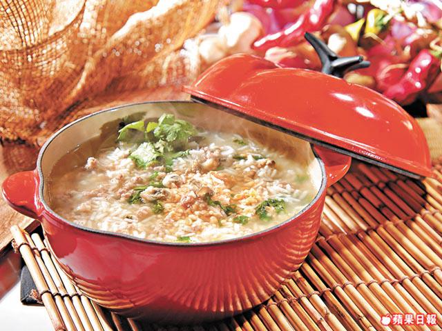 4.雞湯下煲煮滾,加白飯及豬肉碎,然後加雞粉及鹽調味,放入蠔仔肉煮至滾起後,再煮1分鐘後熄火。
