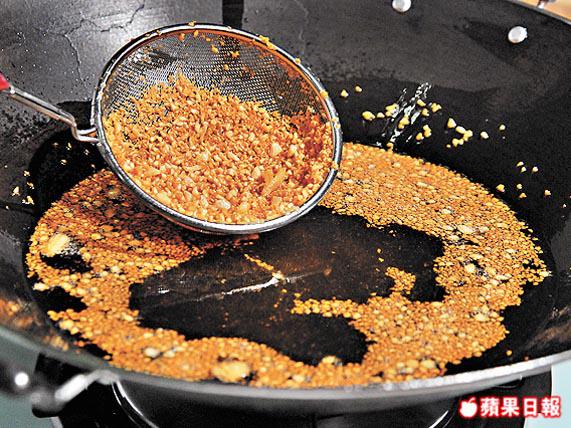 2.燒熱一鑊暖油,放入蒜粒用慢火炸至金黃色,撈起瀝乾油。