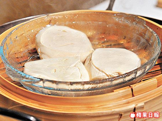 一般做蜂巢豆腐,會將豆腐放入冰格雪一天,翌日解凍後用重物壓着豆腐待出水而做成;但林師傅說只需將豆腐索乾水,蒸20分鐘,一樣做得到。結果,當然好味鬆脆啦!