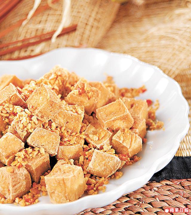 包仔豆腐3件、蒜粒80克、紅椒粒40克、鹽/雞粉各1/2茶匙