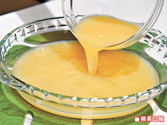 用蒸籠蒸水蛋,倒汗水較少,效果更好;若沒有蒸籠,將蒸碟包上保鮮紙下鑊蒸,效果差不多,但時間要多三分一。