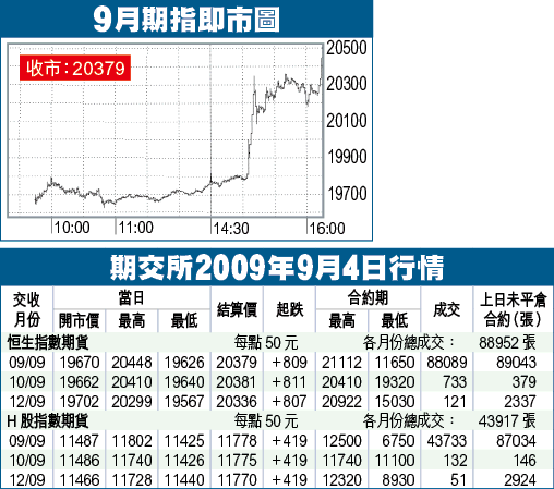 期指在周末前大幅抽升,高開後反覆向上,於午市呈現爆炸性突破,高見20448,以20379高收,暴升809點,轉高水61點。