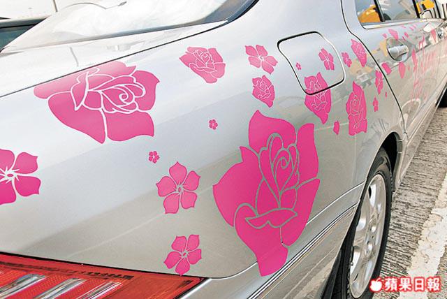 喺車身表面拉花雖然唔係咩新奇事,唔少公共交通工具嘅廣告都見到,不過拉花嘅花車就少見。阿飛指:「有人客唔想太Cutie,會選用名貴房車做花車,要突出又感覺獨特,我哋就諗到用一對新人嘅名去設計一個Logo,再將Logo貼喺車上面。」客人一樣可以自選Logo同設計,加自己個名落去,咁就同人「撞花車」都幾難。最大路當然係心心、玫瑰花等設計,想再出位過癮啲,就可以用一啲大家見慣見熟嘅Logo配襯。將架車咁大陣仗咁貼法,可能有人會怕搞好耐,但原來只需結婚前一日交車,即晚就可以攞走,結婚之後仲會幫你架車打蠟護理,清走PP貼,服務實在幾貼心。