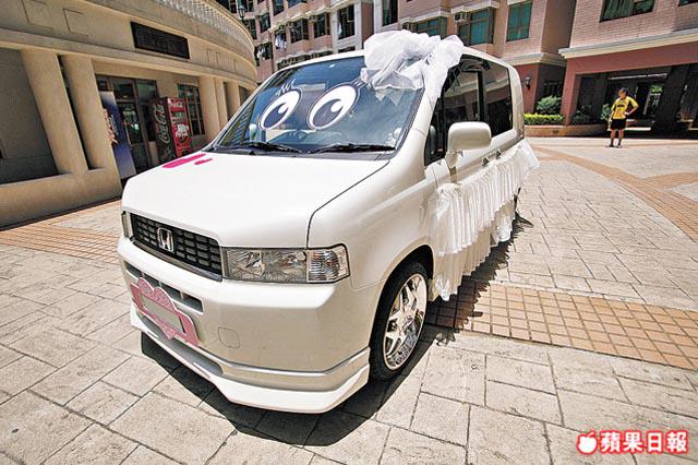 話晒結婚一世人一次,花車獨特出位就最啱,使乜收收埋埋?StarJ就諗到立體花車呢一招嚟吸引顧客,利用立體裝飾佈置,將花車變成一架可愛卡通車。負責佈置嘅阿飛幫花車加帽、加煲呔變紳士,整埋對眼仔喺車頭就更加盞鬼。「西裝圖案係汽車專用PP貼,而立體裝飾就利用磁石固定,方便客人隨時拆除,喺馬路上行駛,拆咗佢安全啲。」鬼馬得意嘅立體裝飾可以隨客人心水設計,用自己車都得。」阿飛仲有啲建議畀大家:「最好就係揀外形可愛或者四四方方嘅車,好似Spike同bB咁。」