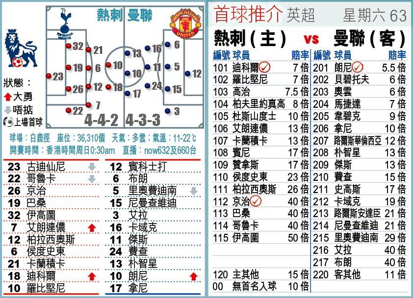 曼聯上場反勝阿仙奴2:1、終止對方連勝走勢,但贏得欠說服力;連同周三世盃外在內,朗尼開「咧」至今於8場比賽入6球,狀態確是很好,但在基斯坦奴朗拿度轉投皇家馬德里後,紅魔中場組織能力明顯受損。事實上,傑斯及史高斯因年紀大而無復當年勇,路爾斯華倫西亞及拿尼則仍有待磨練,故作客近6次迎強隊取得4勝2和(見附表)的熱刺,肯定難打。