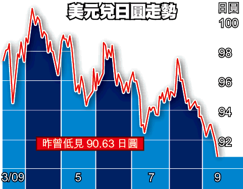 蘇格蘭皇家銀行高級外滙策略師羅布森說,全球經濟復蘇迹象越益明顯,加上各國承諾維持寬鬆貨幣政策,促使更多投資者將把美元用作融資貨幣,以投資於高回報資產,令美元疲不能興。分析員相信,美元疲不能興的局面預期會持續,美元下周或下試90日圓,美元一旦跌穿90日圓,日本出口及股市勢必受挫,引發更多資金流入美債避險,令孳息進一步下跌,加劇美元跌勢;倘日圓升破今年1月高位87.12,升勢將如脫韁野馬。