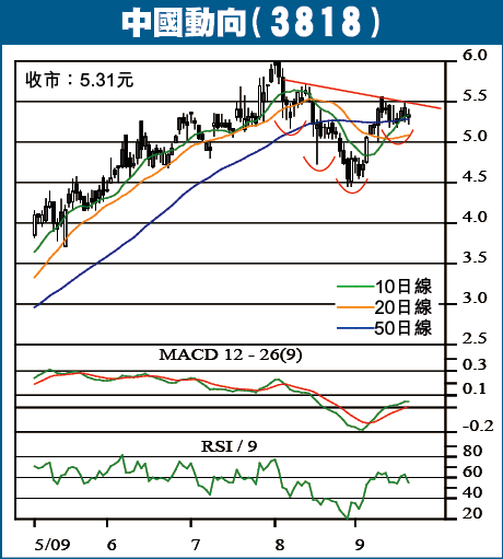 中國動向(3818)早前公佈中期業績,相當理想,股價卻出現獲利回吐壓力,近月來正營造高位複式頭肩底形態,調整可能接近尾聲,可以開始吼位低吸。