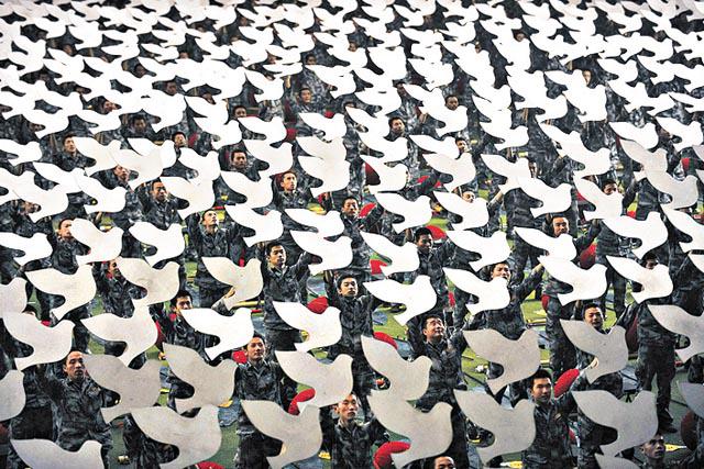 「一會兒是數萬枝桃花在風中輕輕搖曳,一會兒又組成潔白的鴿子展翅欲飛(圖)……」十.一慶典,民眾目光除緊盯長安街上的閱兵和花車巡遊外,還有由八萬中小學生,翻花組成的背景圖案,同樣不能錯過。在歷時兩個半小時的慶典中,他們通過翻動手中的花束,表演了41幅文字和圖畫,共49次變化的背景圖案。