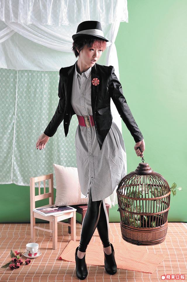 黑色西裝褸$220、藍白色間條恤衫裙$150、黑白色令身leggings$50、黑白色紳士帽$120、粉紅色belt(stylist'sown)、黑色ankleboot(model'sown)