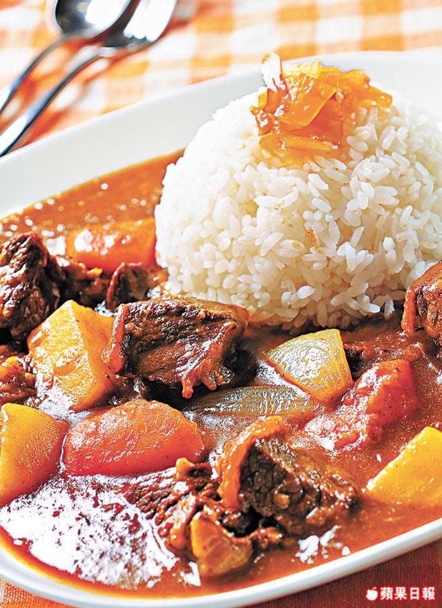 牛肉600克(切粒)、洋葱粒2碗、洋葱絲1碗、薯仔1個(切粒)、紅蘿蔔1條(切角)、蘋果1個、蒜茸4茶匙、福神漬適量、白飯1碗