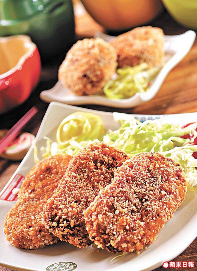 4. 將薯餅蘸上麪粉、蛋漿及麪包糠。用大火燒熱油至大滾,放入薯餅炸至表面金黃,即可撈起。將椰菜絲鋪上碟,放上薯餅,旁邊加沙律醬及豬扒汁即可。