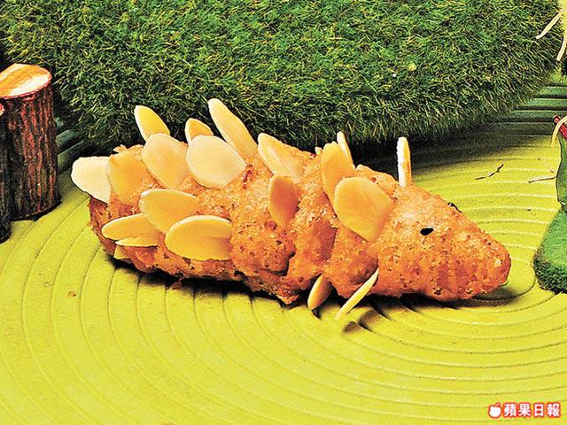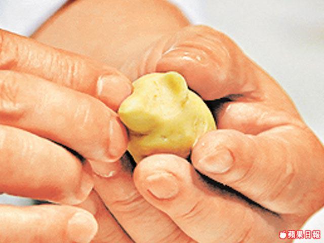 4.芋茸皮分成每件重四錢,包上四錢餡料,搓圓後將一邊弄尖,插上杏仁片,然後貼上黑芝麻作眼睛即成穿山甲。