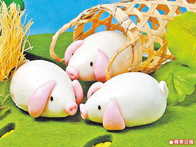 4.將剩餘麪糰分成每粒重五錢,輾薄,分別包上四錢芋茸餡,再揑成小白豬身體,一端尖一端圓。將粉紅色麪糰揑成豬鼻,貼在尖端位置,然後用竹籤插兩孔成鼻孔。再搓兩塊豬耳,貼在頭兩旁,再點上黑芝麻做眼睛,再用麪糰搓一條豬尾,小白豬就大功告成了!不過還要等它發10分鐘,讓它有點發脹後,放入蒸籠,再放入鑊用大火隔水蒸6分鐘即成。