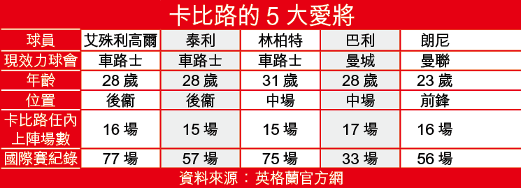卡比路自去年2月帶領英格蘭首仗開始(友賽贏瑞士2:1),合共帶隊19場,當中以現效曼城中場巴利最受重用,上陣場數達17場。至於車路士3寶艾殊利高爾、泰利及林柏特,亦深得他的歡心。文:青蛙仔