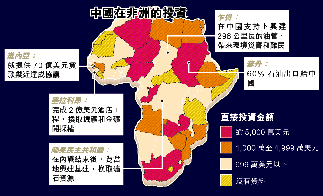 這解釋了中國經濟影響力迅速滲透非洲,包括在安哥拉(Angola)、埃塞俄比亞(Ethiopia)和肯雅(Kenya)包攬了大量基建工程;向蘇丹提供武器,換取每天泵走60萬桶原油,令中非經貿由2004年的237億美元(逾1,832億港元),大增三倍至現時的979億美元(逾7,574億港元)。盧旺達(Rwanda)大讚中國的無條件投資,幫助非洲經濟發展,希望西方也效法中國的做法。