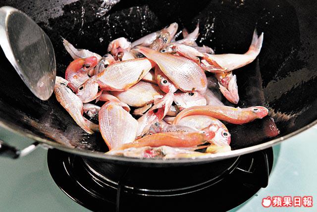 1. 大火燒熱鑊落1湯匙油,下薑片及雜魚,轉中火將魚兩邊煎至熟透後盛起。
