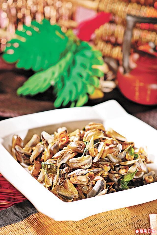 薄殼是平日較少見的海產,秋天才當造,至於九重塔是一種香草,與薄殼一齊炒,不但可掩蓋薄殼的泥味,亦可帶出薄殼的鮮味。
