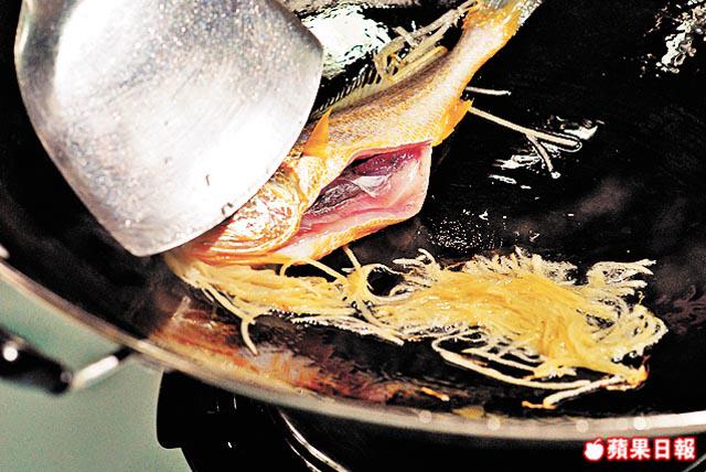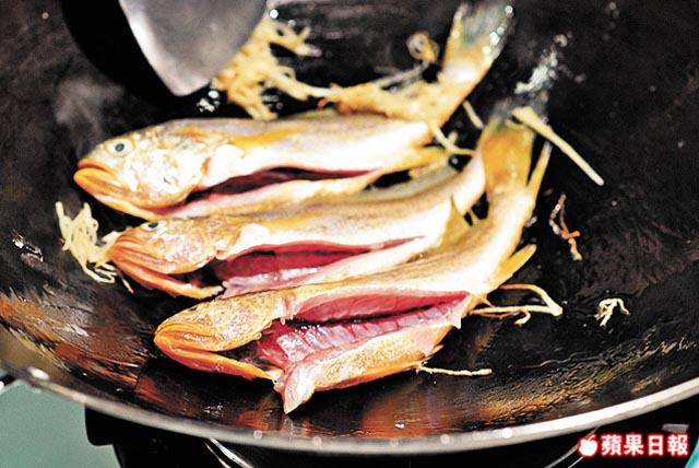 2. 燒熱鑊落1湯匙油,下薑絲及小黃花魚,轉中火將魚兩邊煎至金黃色。