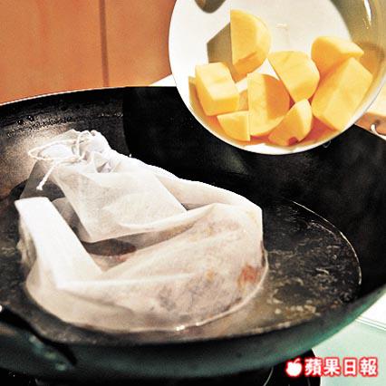 2. 將魚放入魚袋內,放入鑊,下薯仔、番茄及水,用大火煲30分鐘,下鹽調味即成。