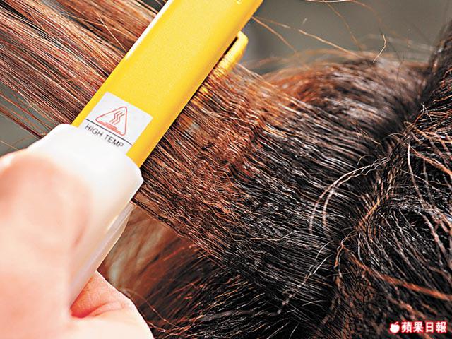 繼續下來,可將夾好的粟米曲髮夾起,餘下的部份則以電髮夾夾曲。其實一般熱髮捲熱力不太傷髮,不過在使用前建議先噴上曲髮噴霧,可令曲髮效果理想及持久,也能省卻頭髮直接受熱力的損害,長頭髮者可把頭髮由底至面分三層均勻噴上。
