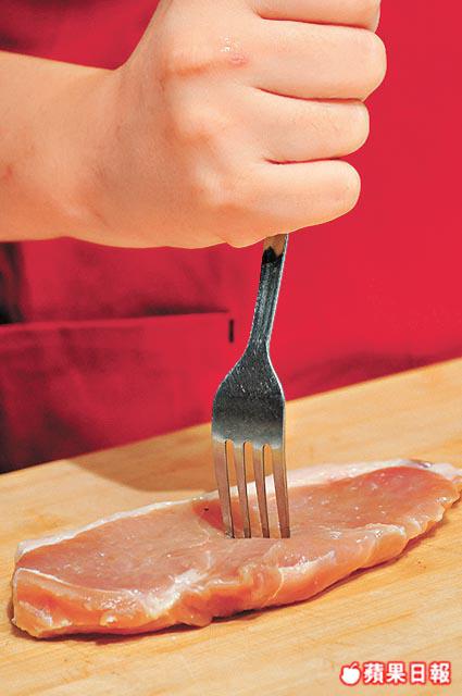 用叉將豬扒叉鬆,可以將纖維叉鬆,而且醃肉可以更入味。