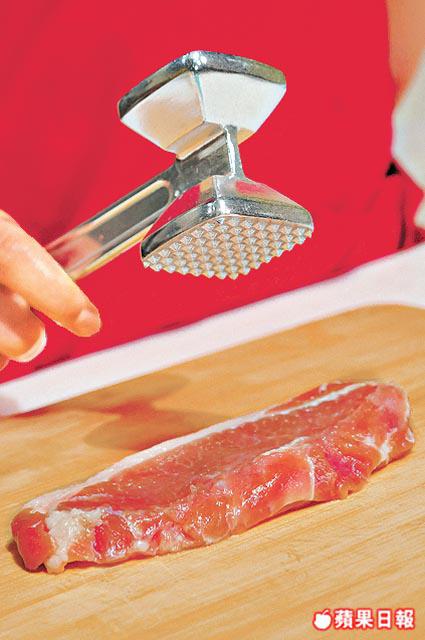 用這種凹凸的槌,在豬扒上每邊搥兩次,方法跟菜刀相似,但肉鎚範圍闊些,可省時間。