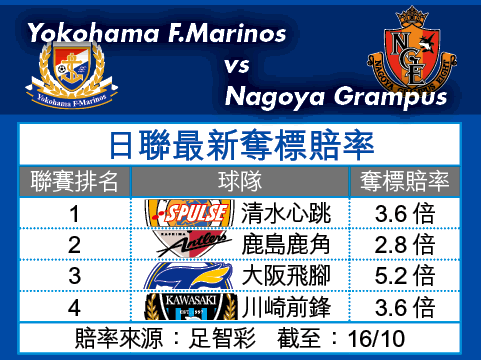 雖然名古屋鯨魚上次在有亞冠盃後顧情況下,大勝鹿島鹿角,但下周中一戰已去到4強階段,周六聯賽再要作客出擊,兼缺射手玉田圭司,料難開W,受讓平/半,捧對家橫濱水手上盤。(球賽編號:星期六14;now633台今日6:00pm直播)