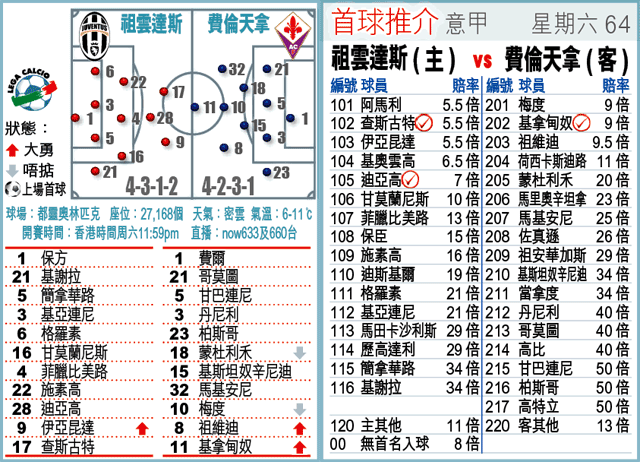 研究祖雲達斯周六主場對費倫天拿時,球迷必考慮到國際賽因素。「老婦人」雖多國腳,但周中出場者寥寥可數,沒體能問題,可望在這場開波時間超正的意甲戰,打敗「3M」失靈的客軍開主W。(球賽編號:星期六64;now633及660台今日11:59pm直播)