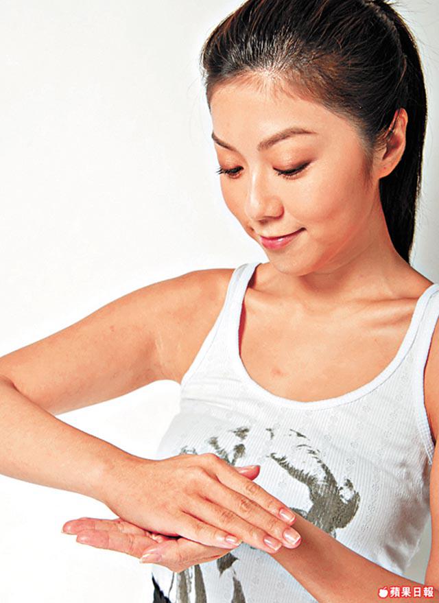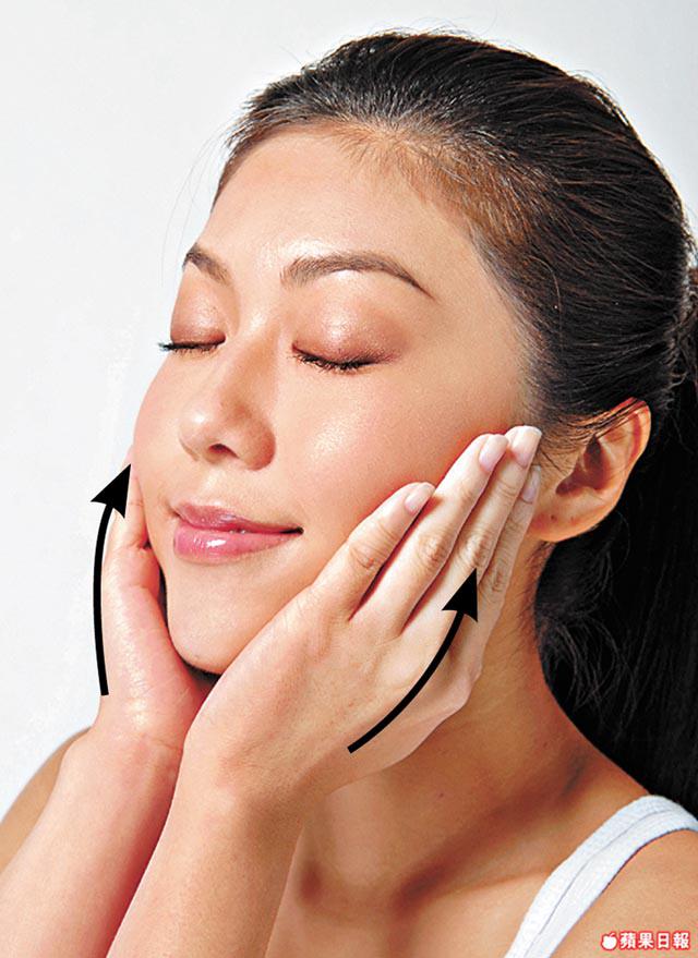 以由下往上的手勢塗上精華素後,再以手掌包裹雙頰並輕輕向上提升,有助緊緻下巴和面頰。