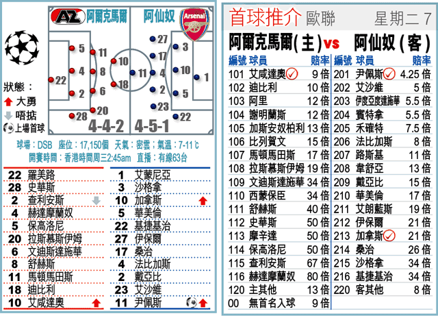阿仙奴打歐聯是信心的保證,更何況周二對手阿爾克馬爾換帥後表現失色,又受會長破產事件影響,故阿仙奴可望於這場H組分組賽開1.5倍客W。(球賽編號:星期二7;有線63台明日2:45am直播)