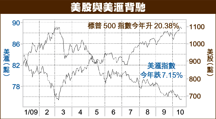 實際上,美滙指數於年頭為81,曾在美股見底的3月初時升10%,而美股同期則挫26%;其後美股由低位持續上揚,累積升逾六成,而美滙則累計下滑了16%。