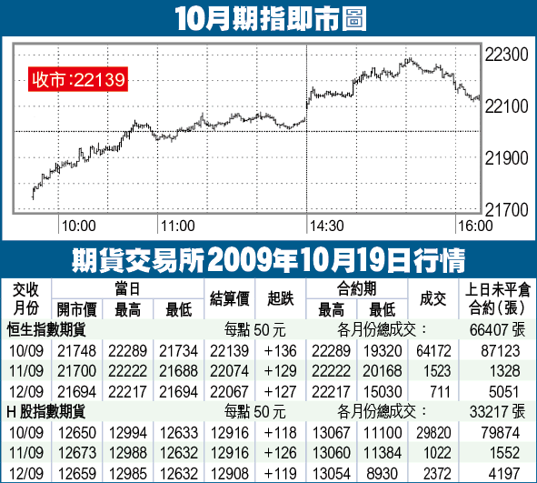 期指低開255點,稍為跌破預期支持21800,隨即轉向挾高,一度升至上周高位,惟尾市出現回吐,以22139收市,升136點,低水61點。