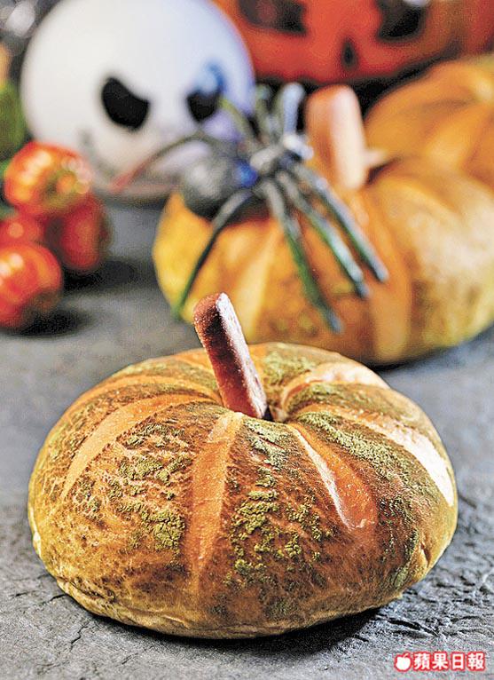 灑上綠茶粉,插上麪包條,南瓜造型的麪包,內裏卻是紅豆餡。