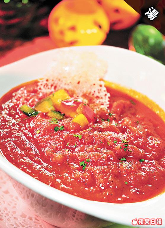 番茄打碎後加上洋葱和西班牙辣腸煮成湯,紅彤彤像血池,番茄味香濃。