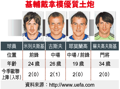 分別出任左右翼的古斯夫及耶莫蘭高,都是基輔重要棋子,其中古斯夫對魯賓卡山更攻入埋齋一球;另外,老牌門將蘇夫高夫斯基是球隊後防的老大哥,不過在國家隊,位置就被薩克達的比耶杜夫所取代。