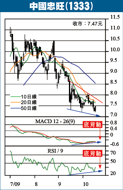 不過,忠旺昨日見7.22元低位後,高收7.47元,以近期罕見的陽燭收市,而且屬於破腳穿頭轉向形態,加上MACD和RSI均出現三底背馳,技術上見底回升的機會甚大。