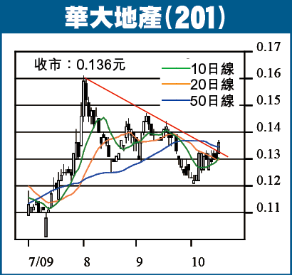 四叔女婿鄭啟文掌舵的華大地產(201),中期業績雖下跌75%至5299萬元,但其賣點主要係港島核心區土儲豐厚,每股資產淨值達0.82元。昨股價突破下降軌,現價可買,短炒目標0.18元,跌穿0.10元止蝕。
