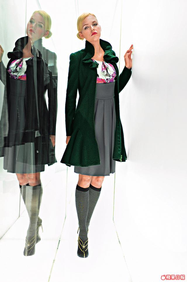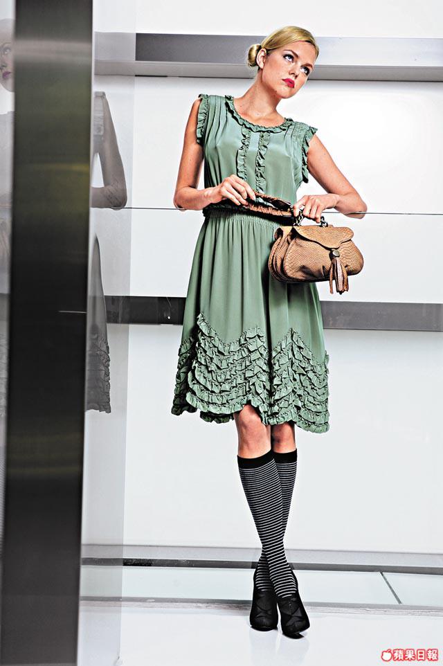 綠色思維下,色彩嚮往校園greenworld,深淺有度的墨綠色、灰綠、橄欖綠、dustygreen,不走明亮鮮活耀目,反而是經提煉、較深色的tone。新作也大玩輕重對比、volume與lightness對比,豐盈的毛毛jacket、車花立體皮褸、如校服褸的羊毛中褸等,以及輕如無物的floralprint雪紡裙、rufflesdress和花邊恤衫搭配。