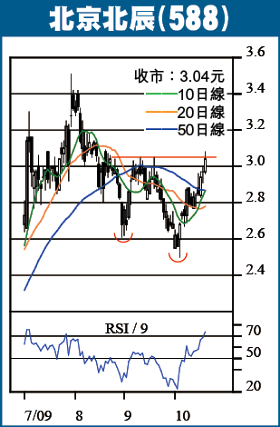 北京北辰(588)昨收3.04元,升2.3%。股價於7月底升至3.51元後回落,曾力守100日線,但9月下旬終告失守,不過股價在2.50元整固後終見回升,本周已升回各短中期平均線之上,10日線料會於今天升越50日線現另一黃金交叉,相信股價會上試7月高位3.51元,破位向3.75元推進。