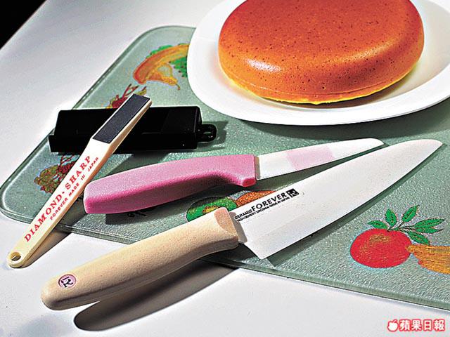 近年新興使用陶瓷刀,日本Forever陶瓷刀套裝,包括兩把刀及磨刀器,切食物鋒利無比,更較一般菜刀輕身。