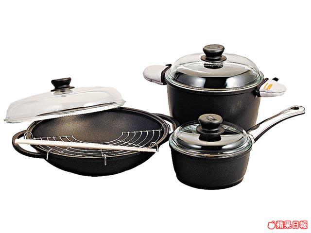 Berndes德國製6件易潔廚具套裝,包括32cm中式鑊連蓋、24cm雙耳高身湯煲連蓋、18cm單柄煲連蓋,最大特點是用少油便能烹調,還不易黐底,食得健康。