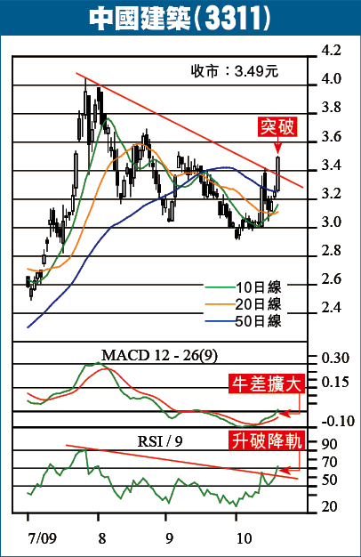 中國建築國際(3311)剛公佈今年頭3季業績,相當理想,股價有反應,以大陽燭升破下降軌,短線將上試4元關口,可吼位吸納。