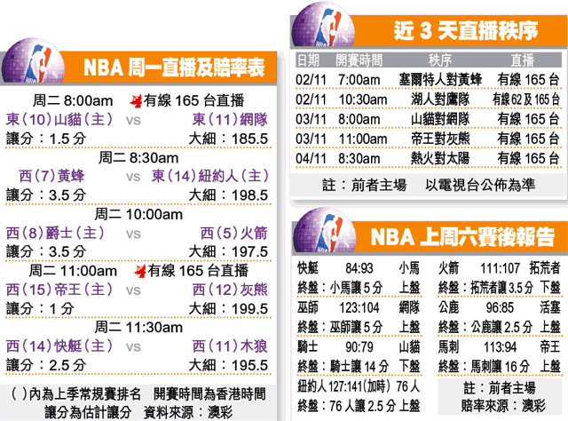 化身「蝙蝠殺手」的馬刺真路比利,助球隊主場以113:94大炒帝王;而小馬繼擊敗衞冕的湖人後,上周六作客再以93:84挫快艇。「德州雙雄」齊贏波慶祝萬聖節,並重回爭標行列。