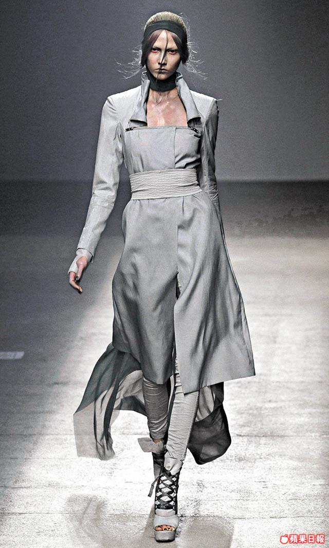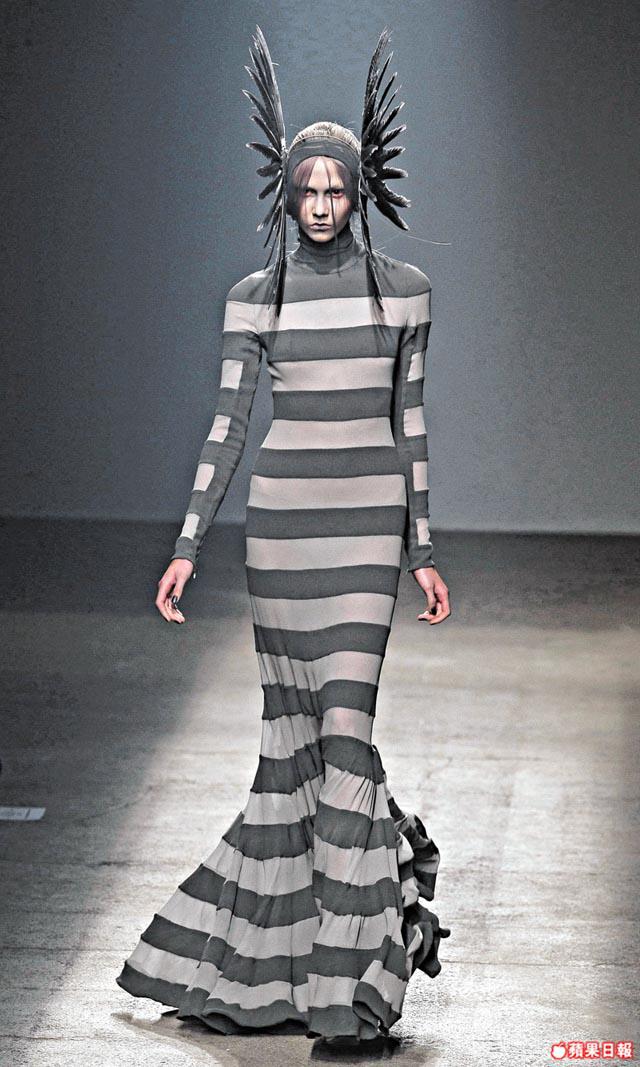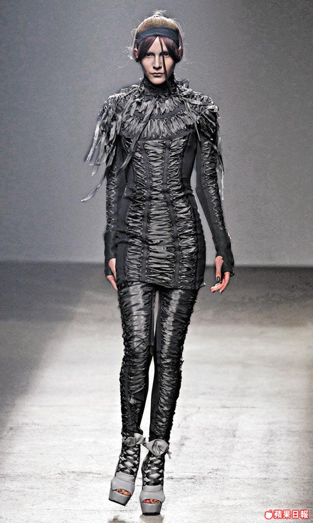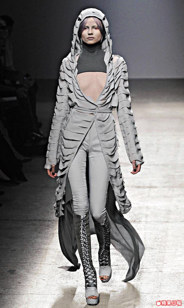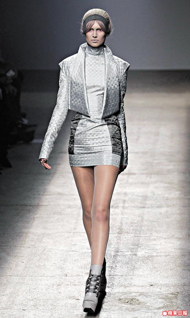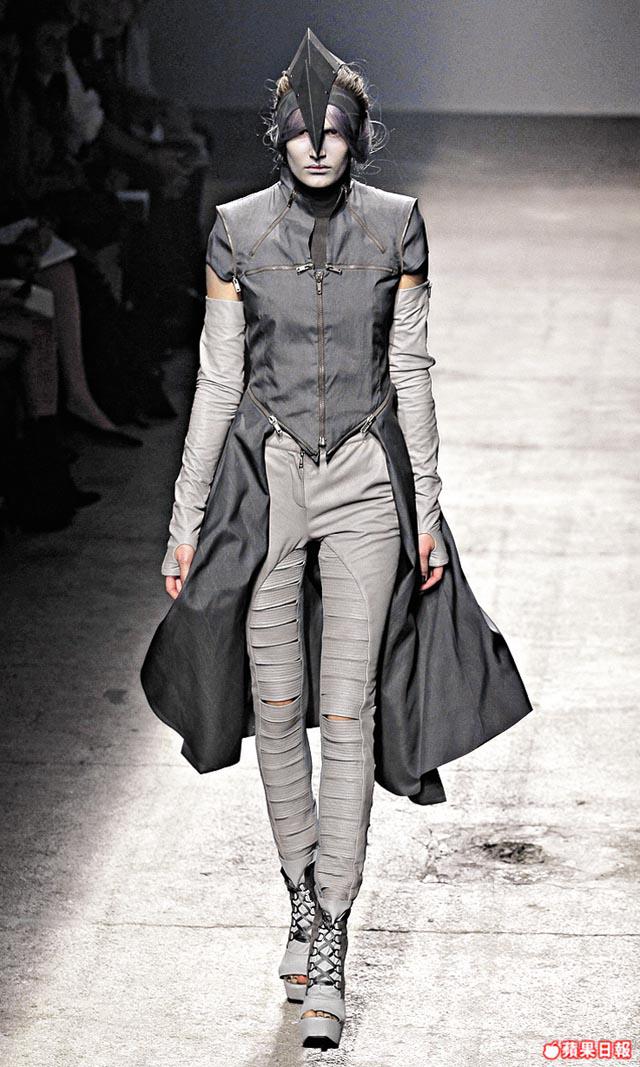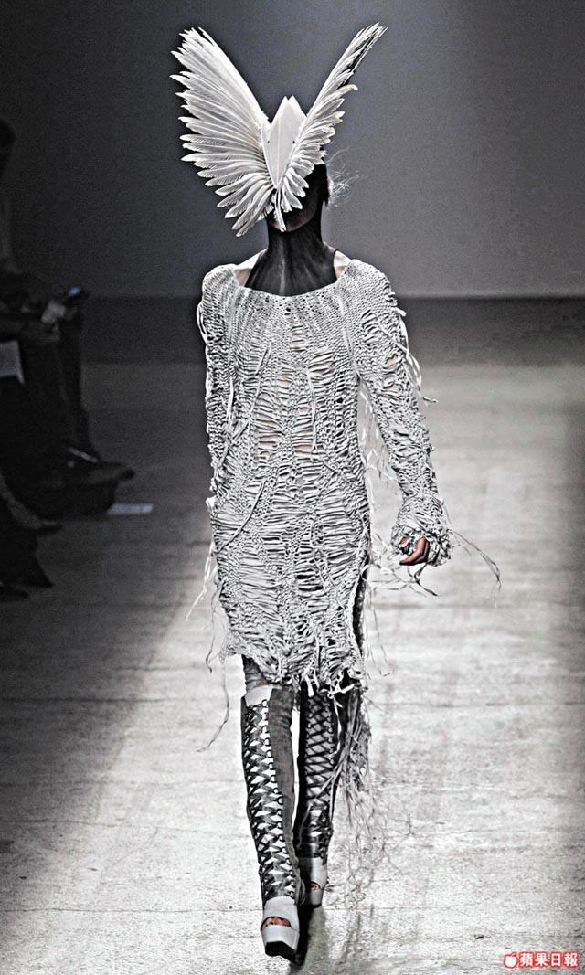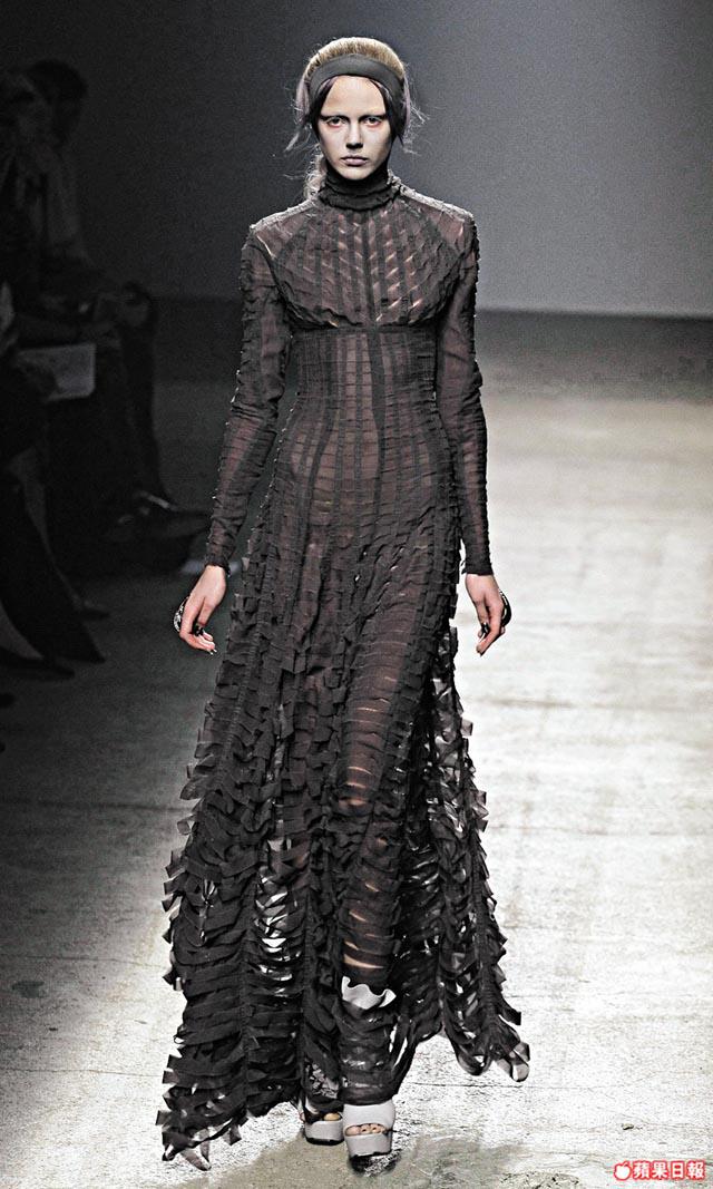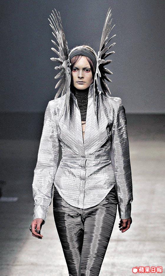 GarethPugh衣衫主打是銀或灰,cutaway、拉鏈、unstructure及mirco-pleated都是重心剪裁細節,也有幾乎是不可能的全透明上衣,但又有完全穿得上街的針織橫間長裙,輪廓中闊大cutaway的外套與纖窄的slashedleggings擦出型格花火,鬼哭神嚎的學生水平大龍鳳被撫平,只剩下巨型羽毛頭飾或耳飾作潤飾。