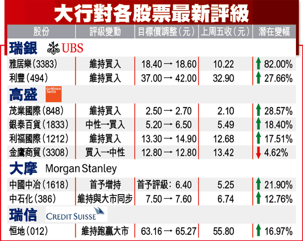 高盛亦指茂業(848)及利福(1212)財政狀況佳,重申兩股「買入」評級,目標價調升至2.7及14.9元,升值潛力29%及18%。