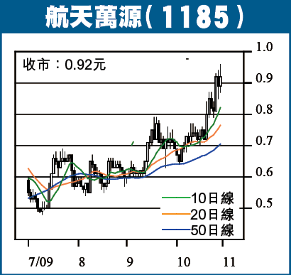 風電股近日走勢十分硬朗,當中中國風電(182)表現最勁,上周五急升8.5%,收報0.89元;連剛搞風電場的群星紙業(3868)都升2.6%,報收3.15元。風電板塊有勢,航天萬源(1185)唔可以錯過,該股上周五創52周高位0.96元,收市報0.92元,升3.3%,股價正沿升軌上升,料破1元無難度,短線目標1.20元。