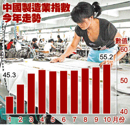 中國製造業採購經理指數(PMI)連續五個月展升勢,據中國物流與採購聯合會昨公佈,內地10月份PMI升至55.2,較9月份上升0.9個百分點,連續8個月高於50分界線(50以上代表景氣擴張),升勢更有所加快,反映經濟加速回升。有專家預料,中國第四季經濟增長可望達9.5%。