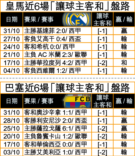 皇家馬德里與巴塞隆拿季初贏到開巷唔識停,兩支西甲雙雄近仗明顯回落,尤其盤路累人不淺。吹脹是皇馬少打一人仍淨勝基達菲2:0開「主勝」益人,偏偏正氣十足的巴塞,卻完場前被奧沙辛拿迫和1:1,失1.35倍熱W,風水輪流轉是也。